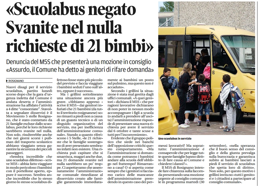 A questo si aggiunge la “sparizione” di 21 richieste per il servizio di scuolabus… A questi genitori si chiede di rifare la domanda, in modo da poter usufruire del servizio dal 6 ottobre..ma fino a quella data dovranno accontentarsi delle sentite scuse dell’amministrazione comunale e intanto fare i salti mortali per accompagnare in qualche modo a scuola i propri figli..